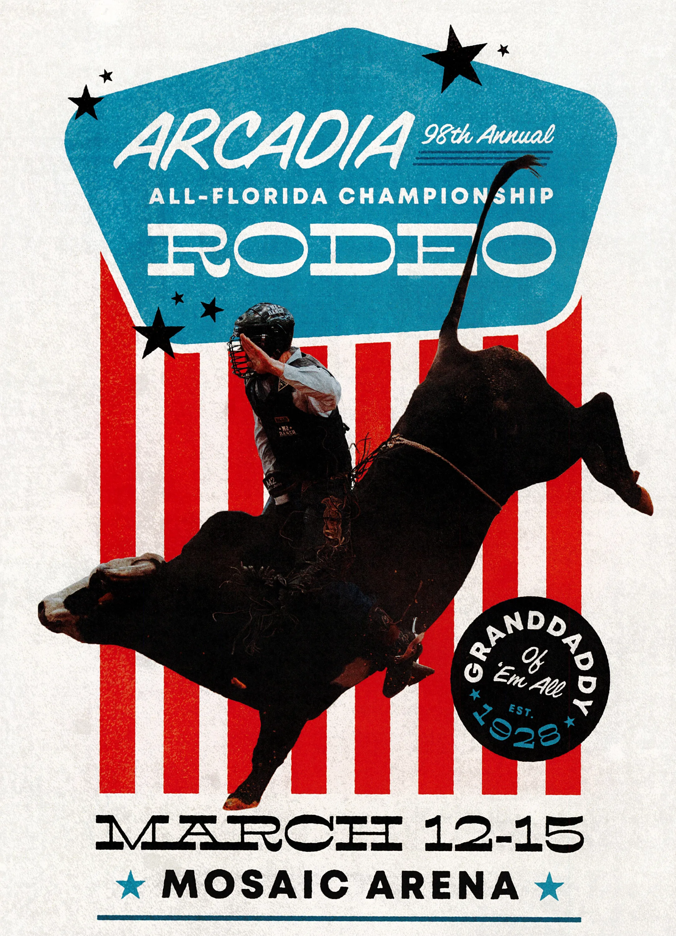 Get ready for four straight days of non-stop rodeo action at the 98th Annual Arcadia All-Florida Championship Rodeo sponsored in part by Visit DeSoto, Florida Power & Light, and Everglades Farm Equipment. Save the date for March 12th-15th, 2026, and join us at Mosaic Arena in Arcadia, Florida for the oldest rodeo east of the Mississippi.