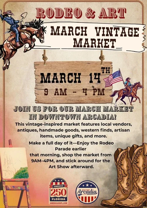 Join Arcadia Main Street for the March Market in Downtown Arcadia, celebrating Rodeo and art.