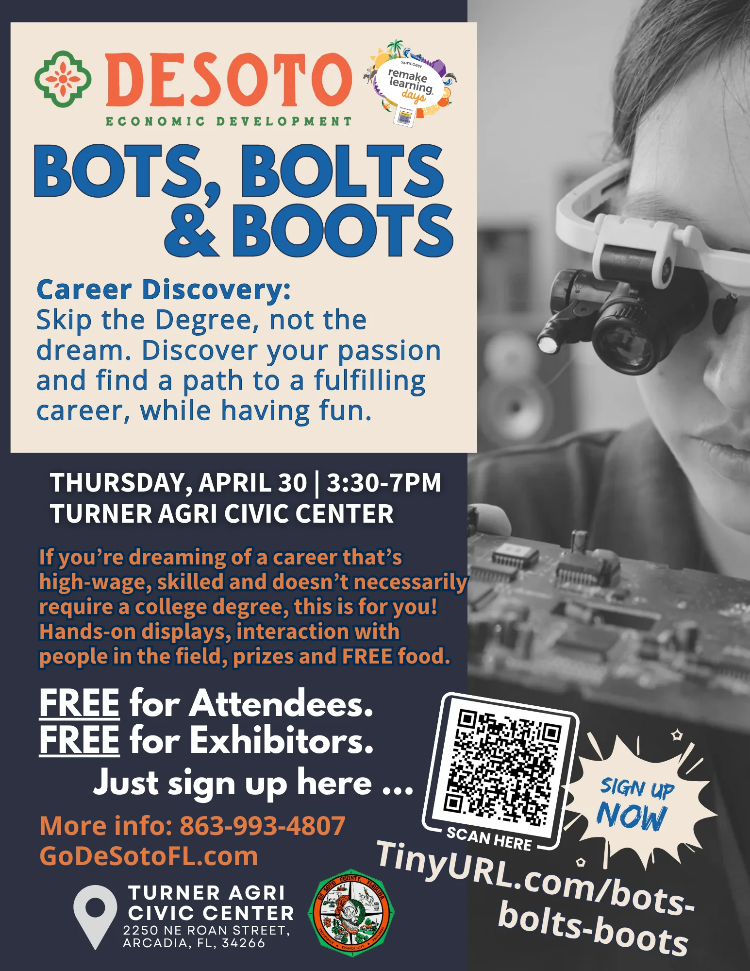 Come experience A free Learning event for all ages at “Bots, Bolts & Boots: Career Discovery event on Thursday, April 30th, 3:30-7pm, at the Turner Agri-Civic Center.
