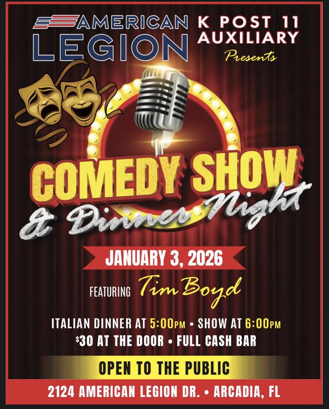 American Legion K Post 11 Auxiliary will be hosting its second year of comedy/dinner night at the post on January 3, 2026, starting at 5pm.