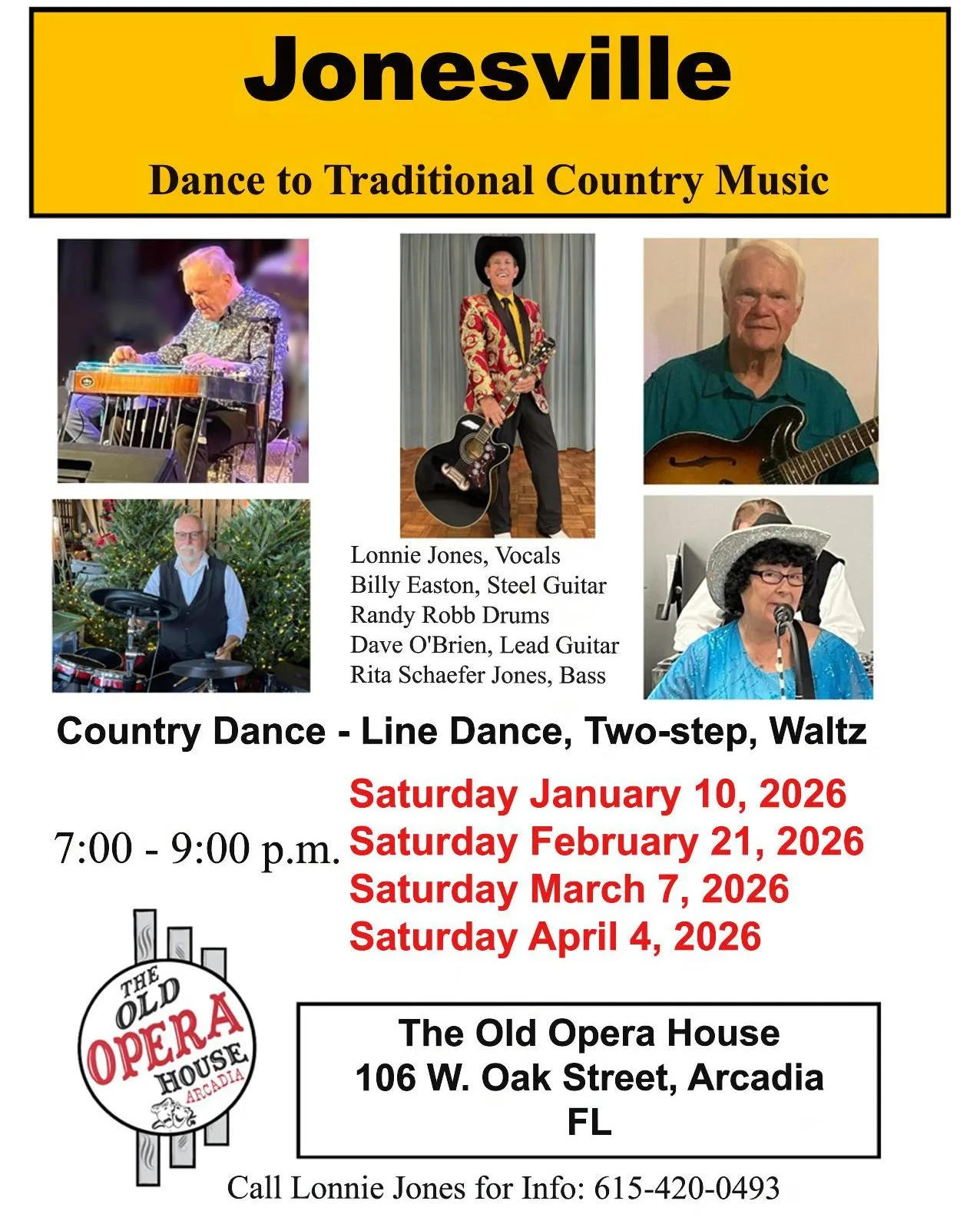 Featuring a stellar lineup—Billy Easton on steel guitar, Dale Werner on drums, Dave O’Brien on lead guitar, and Rita Schaefer Jones on bass—this group brings authentic country charm to every performance.