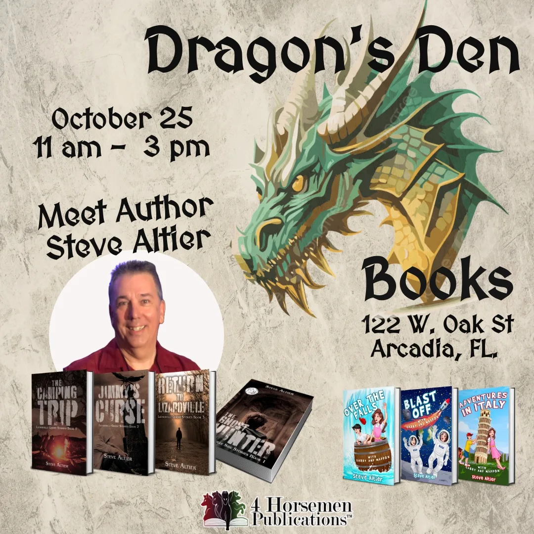 Discover Bestselling Author Steve Altier and the chilling worlds of paranormal mystery and heartwarming adventure at Dragon’s Den Books on Saturday, Oct. 25, from 11am-3pm.