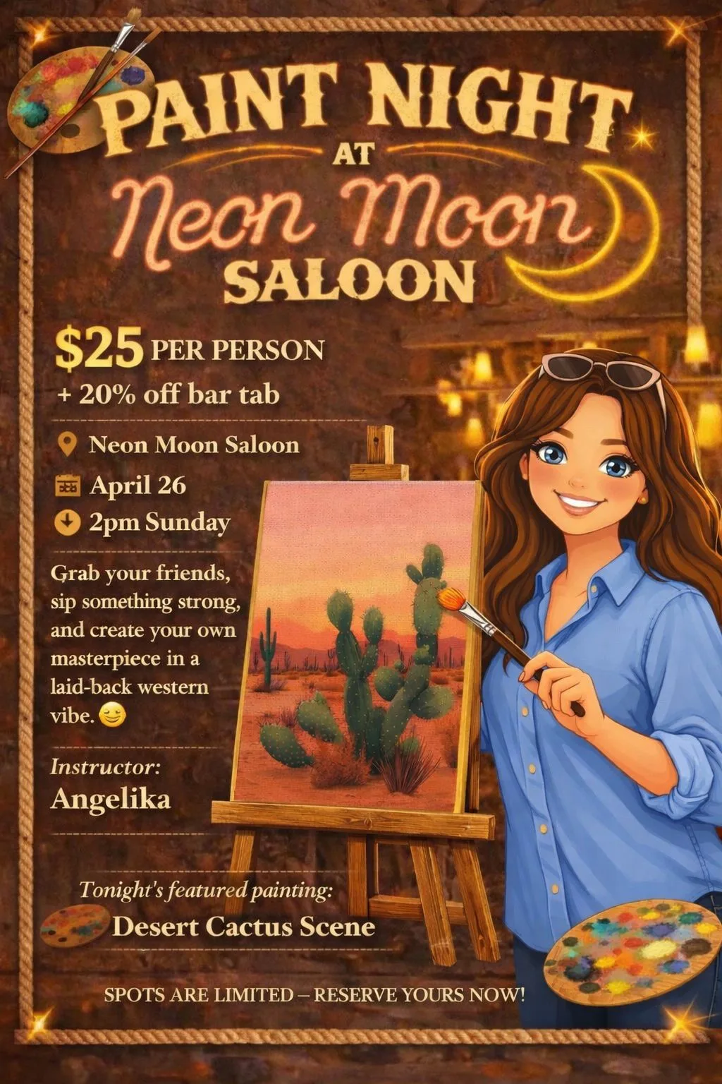 She will be teaching students to paint this dramatic Western Landscape and Sunset. So fun!!! Make your reservations NOW! Please RSVP to Angelika or the Neon Moon Facebook page so she knows the supplies to bring.