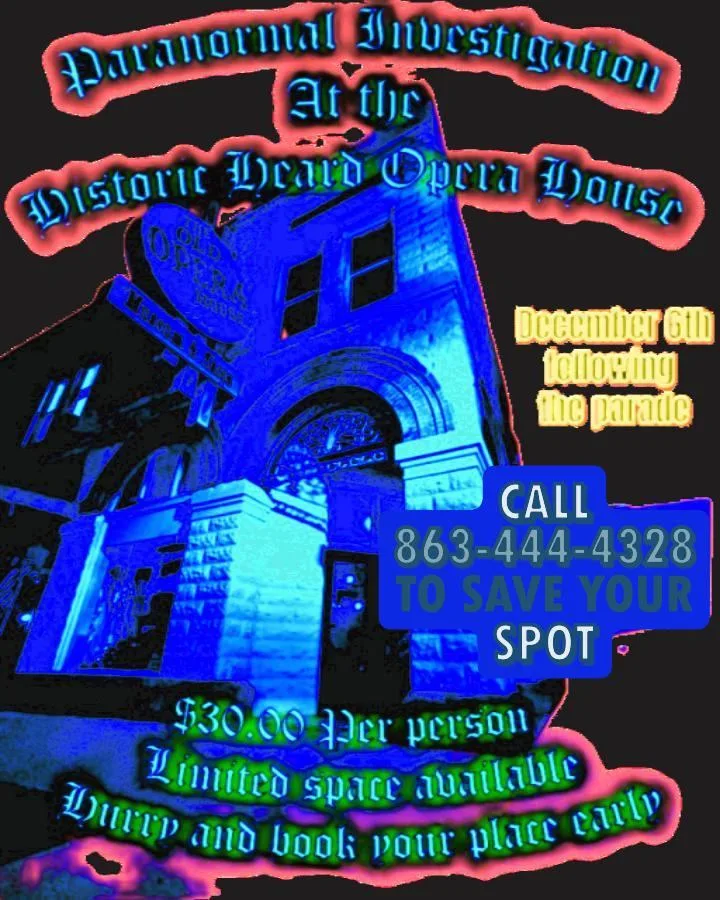 Join us for a 3‑hour paranormal investigation inside the legendary Historic Heard Opera House!