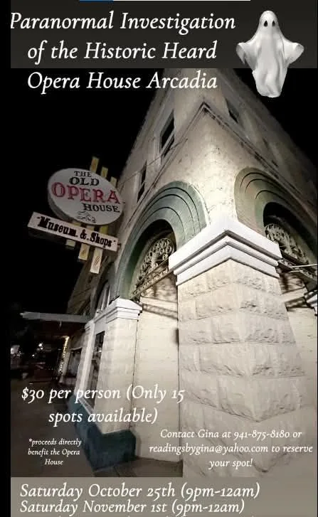 Enjoy a three-hour paranormal investigation at The Historic Heard Opera House Arcadia Saturday, November 8th, starting at 9:30pm.