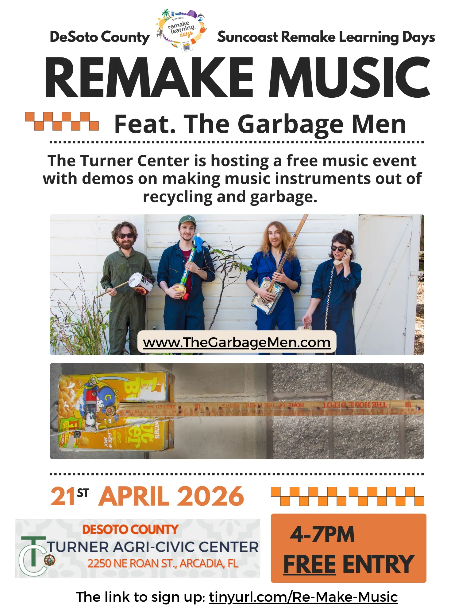 A free event for the whole family! Unleash your inner musician with Sarasota-based band The Garbage Men, and others, on Tuesday, April 21, 4:00-7:00 PM, AT the Turner Agri-Civic Center.