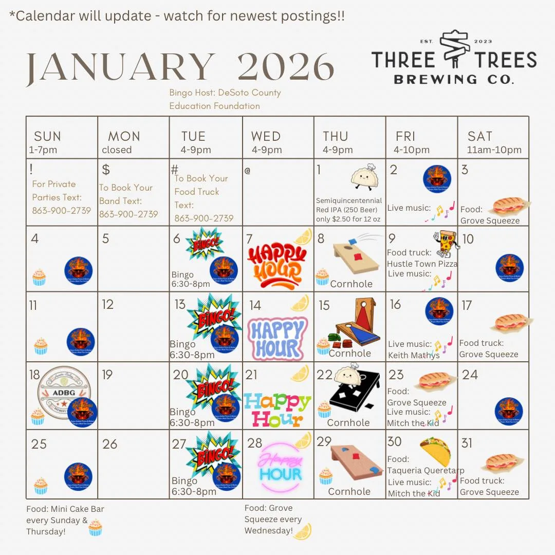 For more information, call (863) 900-2739, email [email protected], or go to threetreesbrewing.com.